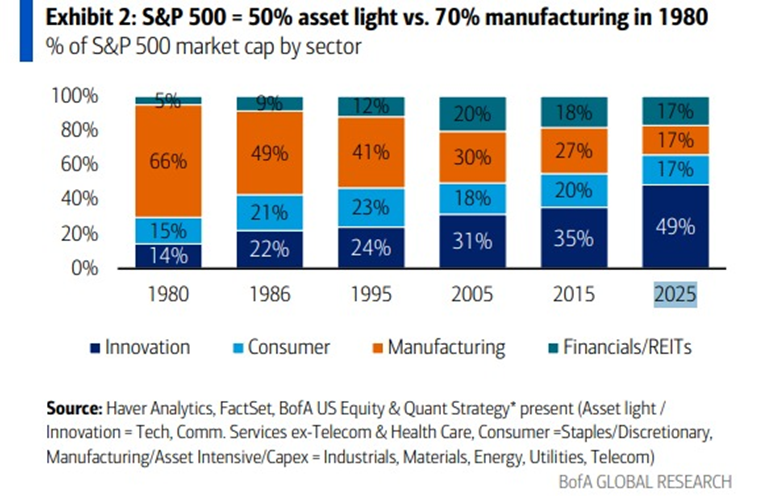 While optically markets seem more expensive today, one of the larger reasons for this multiple expansion is the proliferation of higher ROE businesses. In seeing the S&P sectoral weight over time, asset heavy manufacturing went from 2/3rds of the market to just 17% over the past 45 years!