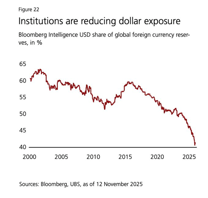 Over the last 25 years, the use of the U.S. Dollar for foreign currency reserves has steadily declined from 61% to 41% with a steep acceleration in the fall last year.