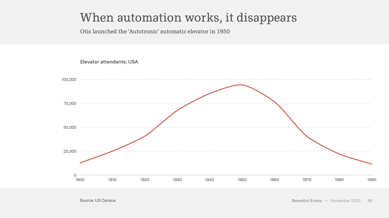 Otis launches the automatic elevator in 1950 making the elevator attendant redundant. From almost a lakh attendants at the peak, during the launch, the number came down 90% to under 10,000 in four decades. There are a few contenders for GenAI’s elevator attendant.