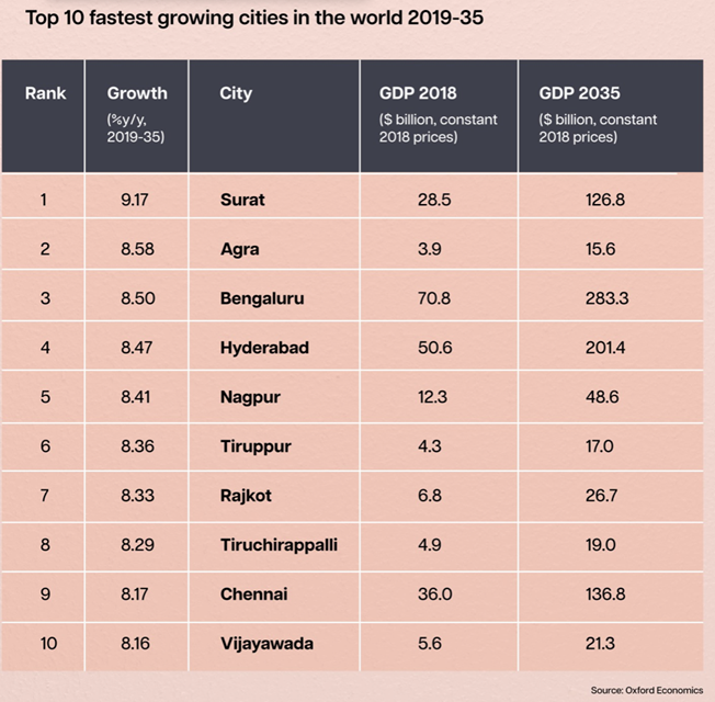 All of the top 10 fastest growing cities globally are all in India. Some very interesting names in the list to escape Bombay air!