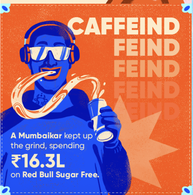 A single Mumbaikar accounted for a 16.3 lakh spend on Red Bull Sugar Free. At 125/- per can, this accounts for a whopping 13040 cans or 35 cans per day or two cans per hour awake!