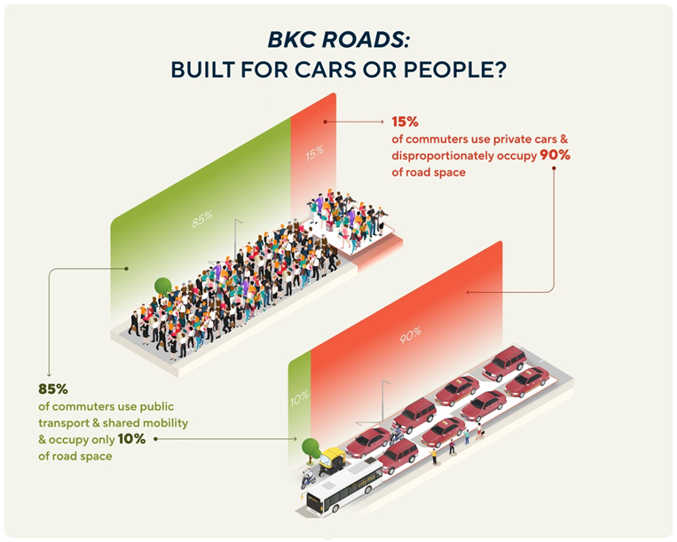 15% of commuters use their private vehicles to get in and out of BKC and they occupy 90% of the road space. The true sign of progress is not the proliferation of private vehicles but seeing everyone use public transport. One percent delta on the other side can all of a sudden make our trafficked roads look better!