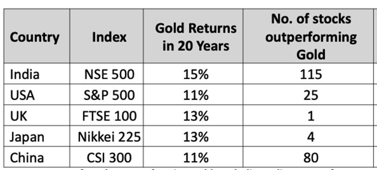 Of the 500 NSE500 stocks, 115 have outperformed gold in the past 20 years. An active investor in any other market had a far lower chance to outperform their mothers.