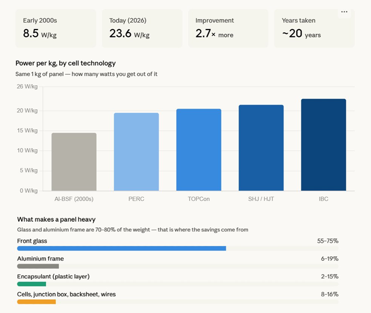 And why are they lighter? Not because the silicon cells became lighter - cells are tiny. The answer is the glass sheet on the front and the aluminium frame around the edge. Together these two alone are roughly 70–80% of a panel weight. Makers have slowly made the glass thinner (from 3.2 mm to 2 mm dual-glass), and frames skinnier. That is where almost all the weight savings came from”