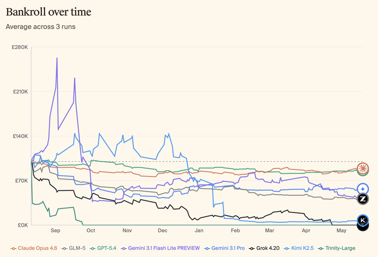 “Aggressive staking arising from overestimating an edge” resulted in all models losing money vs. the 100k they started with 3 of the 8 models also going bankrupt.