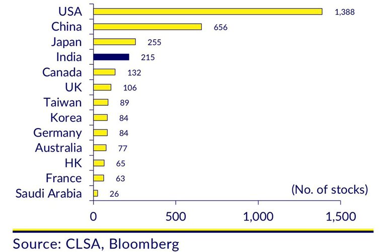 Number of public companies with over $5b market cap across markets sees India at 4th spot with 215 companies. Remains to be seen how many more are added to this list with our long runway for growth.