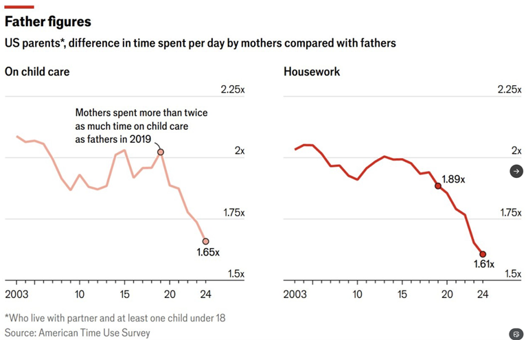 Mothers spent more than twice the amount of time father’s did on childcare. Post COVID and with the advent of work from home, that number has fallen to 65% more vs. 100% more earlier.