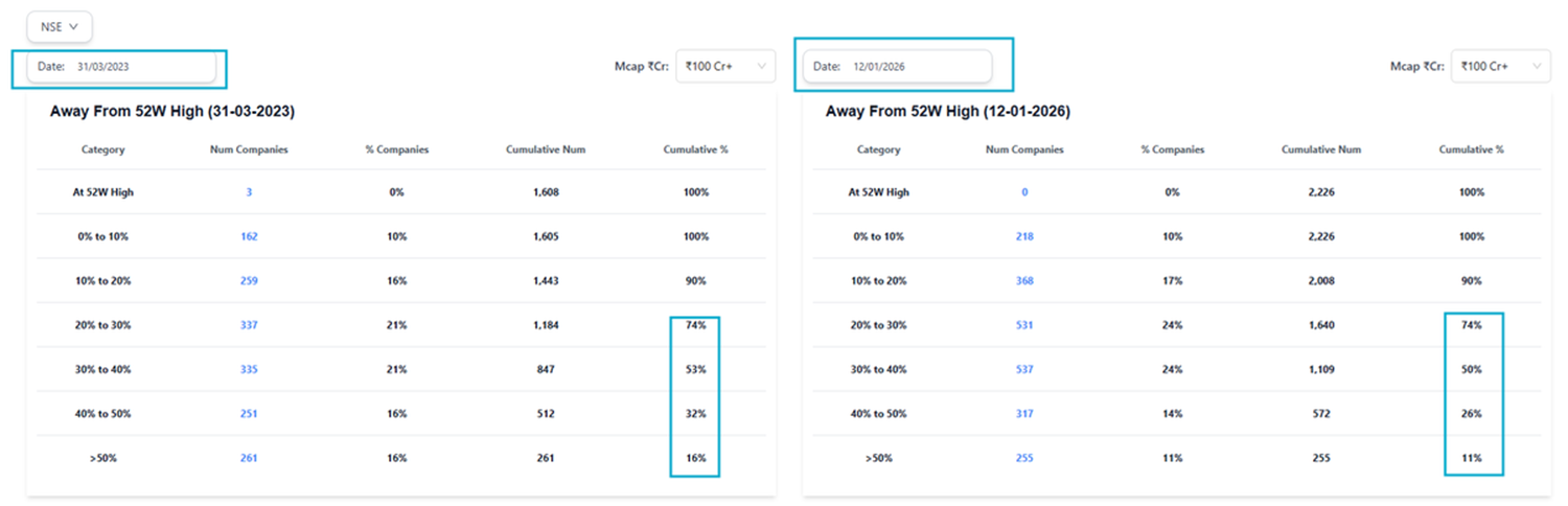 The last splendid melt up in the market started post the bottoming out in March 2023. Correction across the breadth of the market has reached similar levels now. The only difference being that the headline Index has not shown the pain this around.