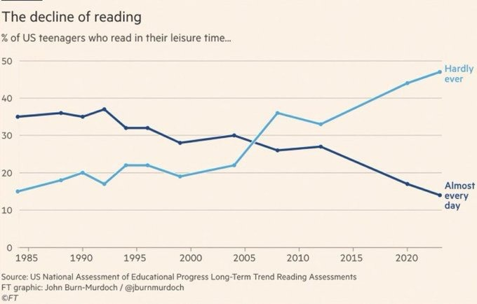 Sincethe advent of social media, there is a dramatic shift in the reading habits of teenagers in the US. Almost half of them claim to hardly ever read for leisure vs. 20% two decades back!