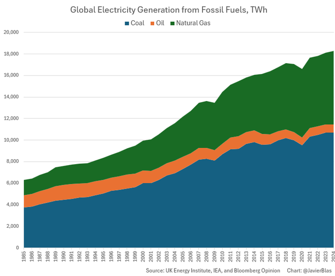 “The green slogan says the world is moving away from hydrocarbons into electrons. But then there's the question of how those electrons are produced (in absolute terms, rather than as a share).”