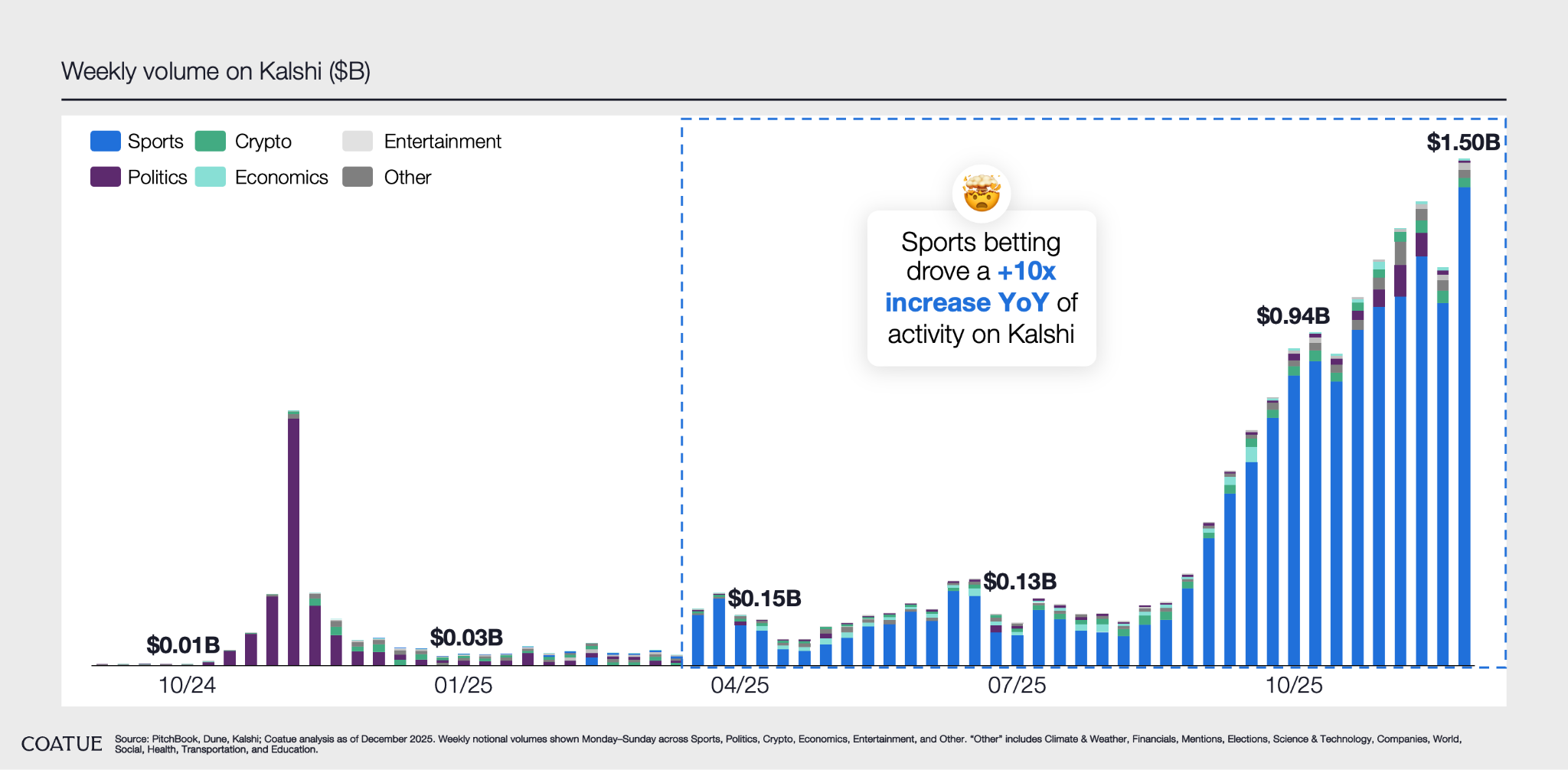 “Kalshi is the first CFTC regulated exchange dedicated to trading on the outcome of future events. From inflation, to fed rates, to unemployment, to will the government shut down, Kalshi allows people to trade on a broad range of topics.” and the largest volume is drawn in on sports!