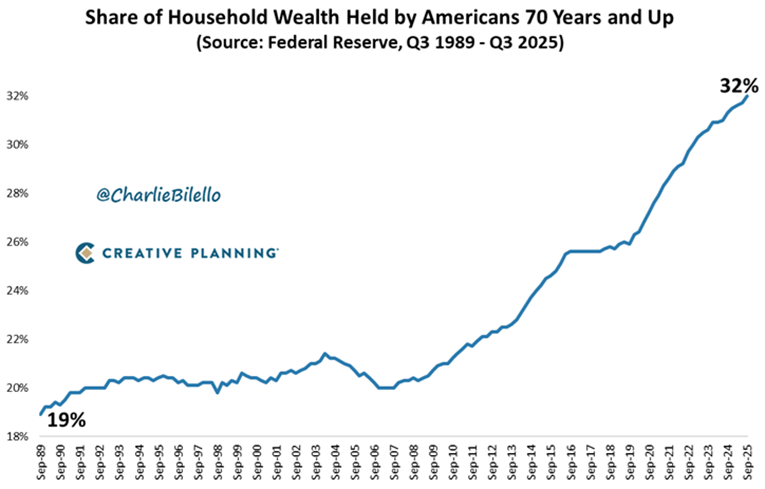 “A record 32% of household wealth is now held by Americans that are 70 years of age and older.” Clearly only the old can afford to age like fine wine now.
