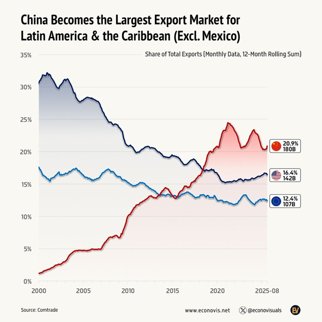 China now reflects 20.9% of Latin American and Caribbean exports, excluding Mexico, marking the 6th consecutive year with a weight above 20.0%.