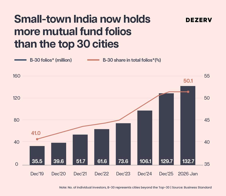 “In January 2026, cities beyond India's top 30 financial hubs crossed 50% of the country's mutual fund folios for the first time. B-30 folios stood at around 35 million in December 2019. Today, that number is nearly 133 million. Almost fourfold in six years.”