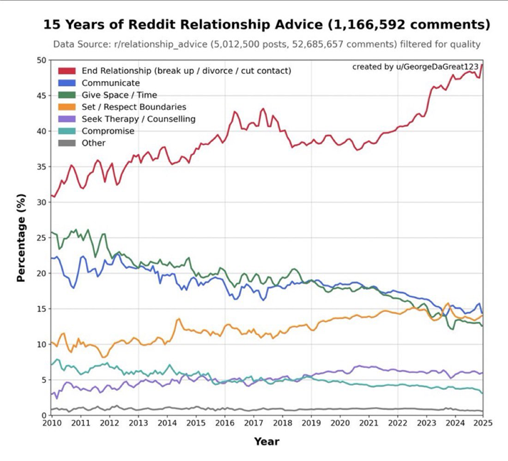 A researcher filtered r/relationship_advice down to 1,166,592 quality comments and tracked what people actually recommend. In 2010, “End Relationship” sat around 30%. By 2025, it’s approaching 50%.