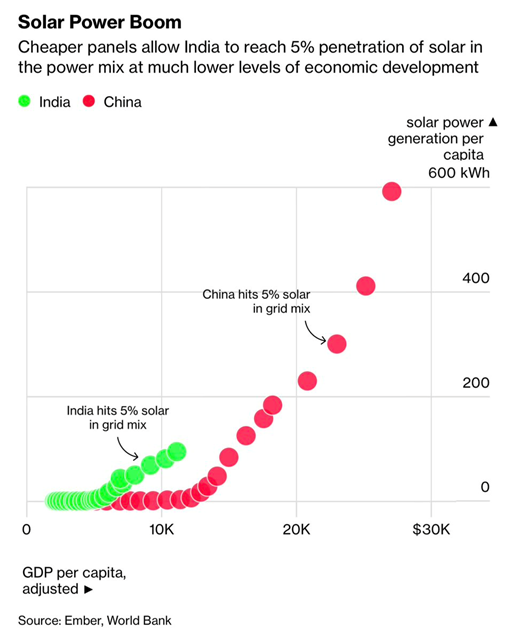 “India is electrifying faster than China did at a similar level of economic development, using fewer fossil fuels per capita. This is largely due to the availability of cheaper solar panels and electric cars, allowing India to reach 5% solar penetration in its power mix and 5% electric car sales at lower income levels. While India still relies heavily on fossil fuels, its per-capita consumption is significantly lower than China’s was at the same stage of development.”