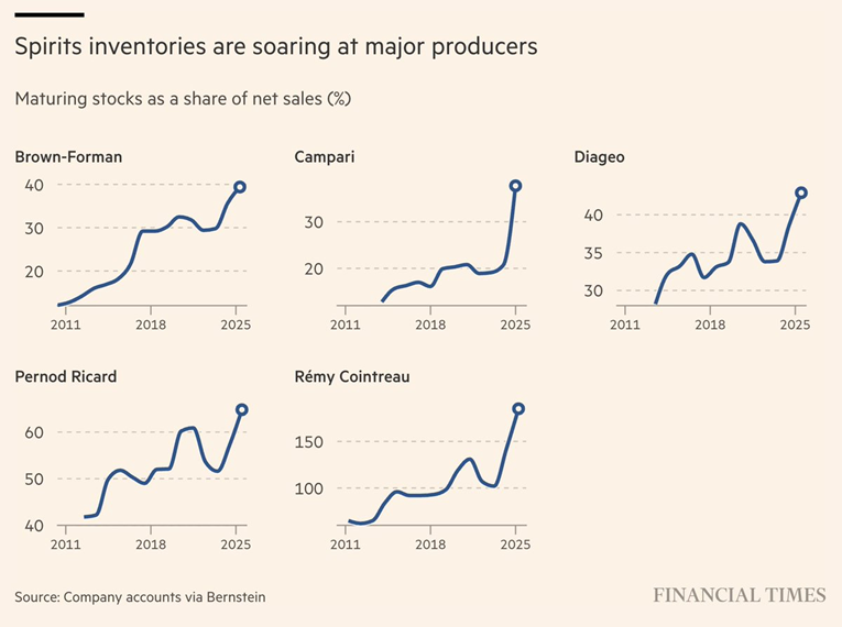 “Alcohol companies are sitting on huge stockpiles as demand keeps falling. Five of the world’s largest listed spirits makers – Diageo, Pernod Ricard, Campari, Brown-Forman and Rémy Cointreau – are holding about $22bn worth of ageing spirits, the highest inventory level in more than a decade.” Between GLP1, weakening consumer sentiment amidst high inflation, and in general preference for non-alcoholic highs for genZ- there seems to be a structural fall in the demand for spirits globally.
