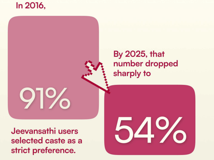 Over the past decade the role of caste has evolved, with the shift being most prominent in metros with only 49% of users secting caste as a strict field.