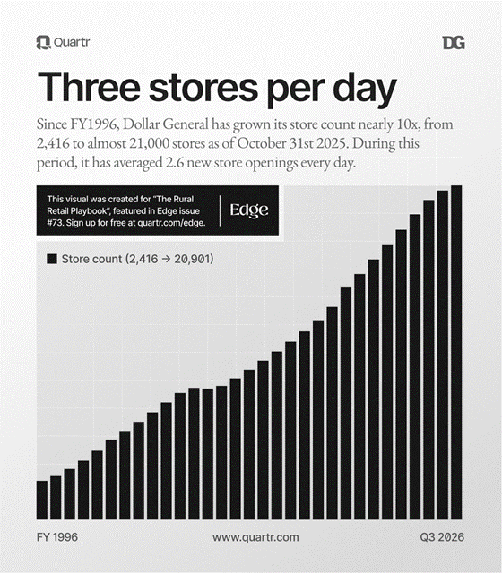 Dollar General (a rural retailer in the US) has gone from 2400 stores in 1996 to 21000 stores averaging a 2.6 store openings every day for three decades!