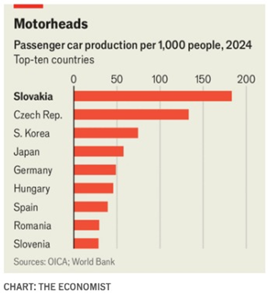 "Slovakia punches well above its weight. In 2025 it manufactured nearly 1.1m vehicles, more than anywhere else in the world per head of population (see chart). The industry is the heart of the country’s economy, contributing around 10% of GDP and directly employing 170,000 people. Almost all the cars head abroad, making up around a third of Slovakia’s exports."