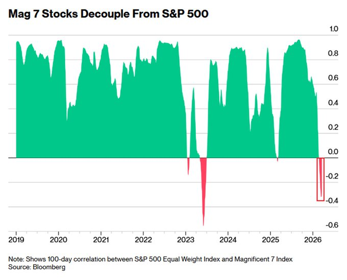 The 100-day correlation between the Magnificent 7 Index and the S&P 500 Equal Weight Index is down to -0.27, the most negative reading since June 2023.