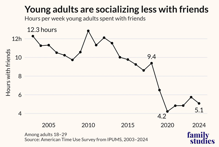 Young adults are spending 50% less time with friends than they were 15 years ago.