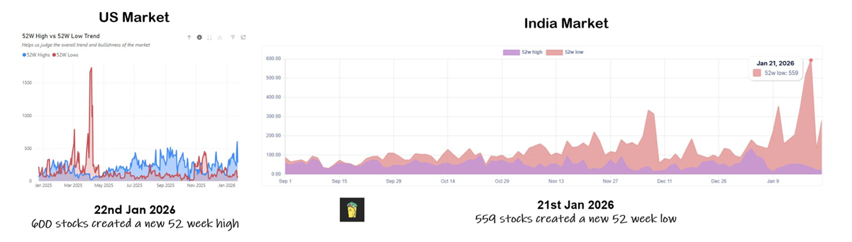 22nd Jan- 600 stocks in the US market created a new 52 week high (highest in 2 years). 550 stocks in India created a new 52 week low (highest number in a year).