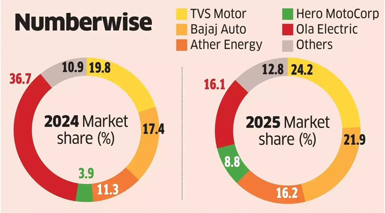 Every two wheeler EV company saw a rise in market share with Ola’s market share dropping more than 50% in the same time frame.